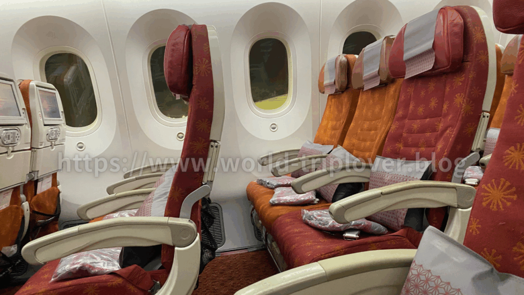 座席は3-3-3配列のエコノミークラス。足元もそこまで狭くありませんが、クッション性はやや硬めで長時間のフライトでは腰に負担がかかります。
