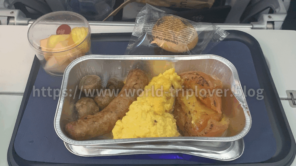 羽田到着前には朝食として「ソーセージ・エッグ・トマト」が提供されました。こちらも味が薄く、どことなく冷めている。見た目も食欲をそそる感じではありませんでした。