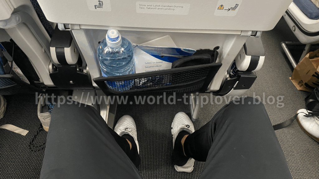 エコノミークラスの座席は3-3-3配列。足元も少し余裕があり、軽く足を組める程度。