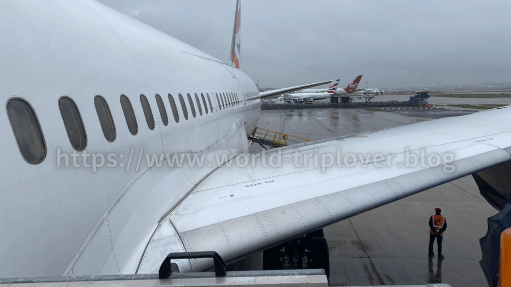 まずは空港内を電車で移動し、さらにバスに乗って搭乗口へ。ヒースロー空港の広さを実感しました。その分、間近でB787-9を見られるのは圧巻。