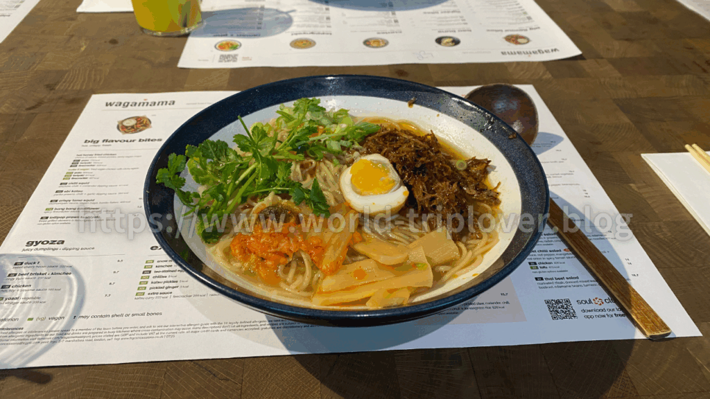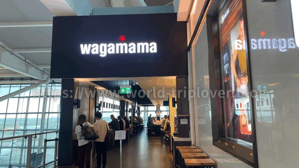 フライト前に立ち寄ったのは「WAGAMAMA(ワガママ)」という日本食レストラン。イギリスでは有名なチェーンで、日本風ラーメンや丼が楽しめます。