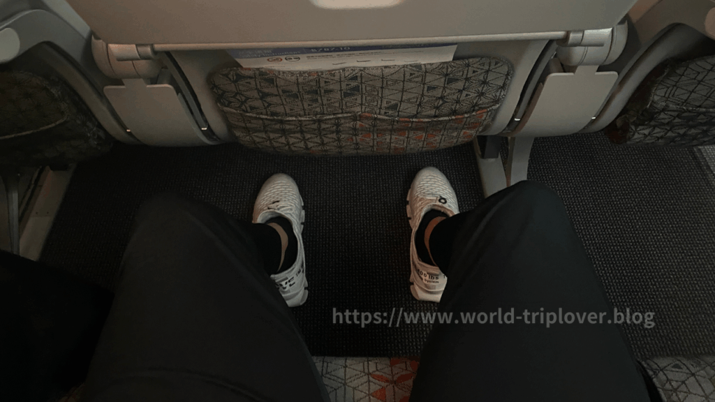 座席に着くとまず驚くのが広さと清潔さ。最新機材ということもあり、足元のスペースにもゆとりがあります。