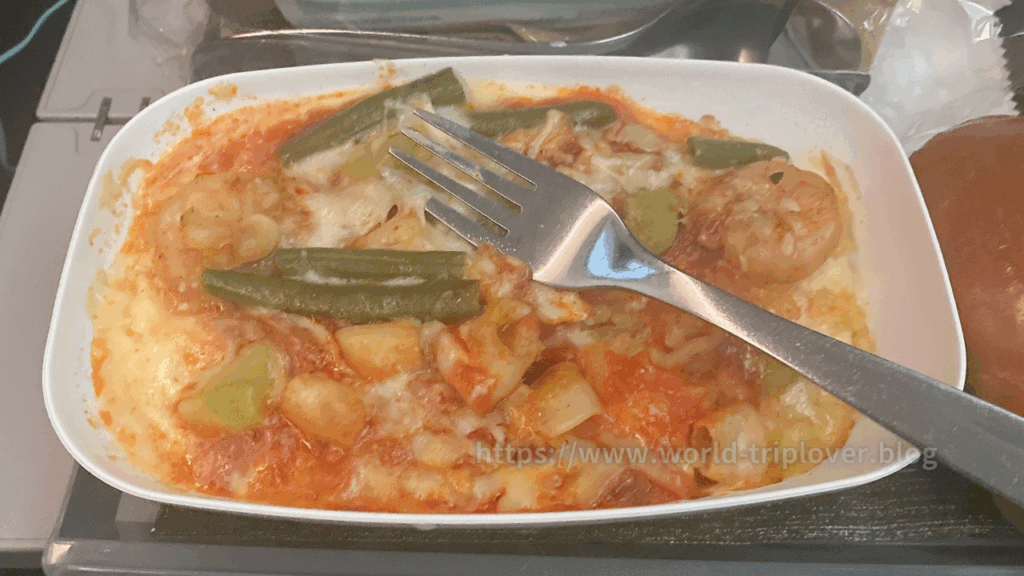 離陸して約1時間ほどで配られたのは、海鮮パエリア風の機内食。エビやムール貝が入った色鮮やかなメニューで、味付けも控えめで食べやすい。