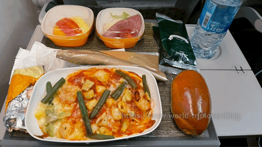 夜のフライトでも重すぎず、ほどよい満足感のある内容でした。ドリンクはワインやジュース、コーヒーなどが選べます。