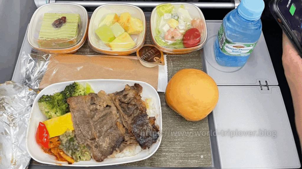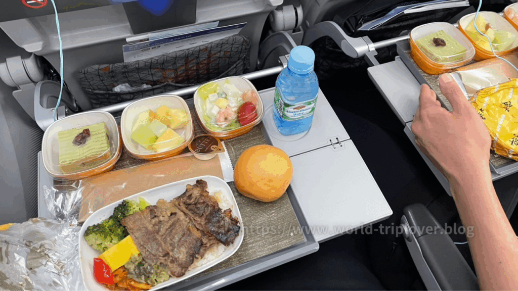 離陸後1時間ほどで配られたのは、ビーフライスの機内食。しっかりとした味付けで、柔らかいお肉と温かいご飯の相性が抜群でした。