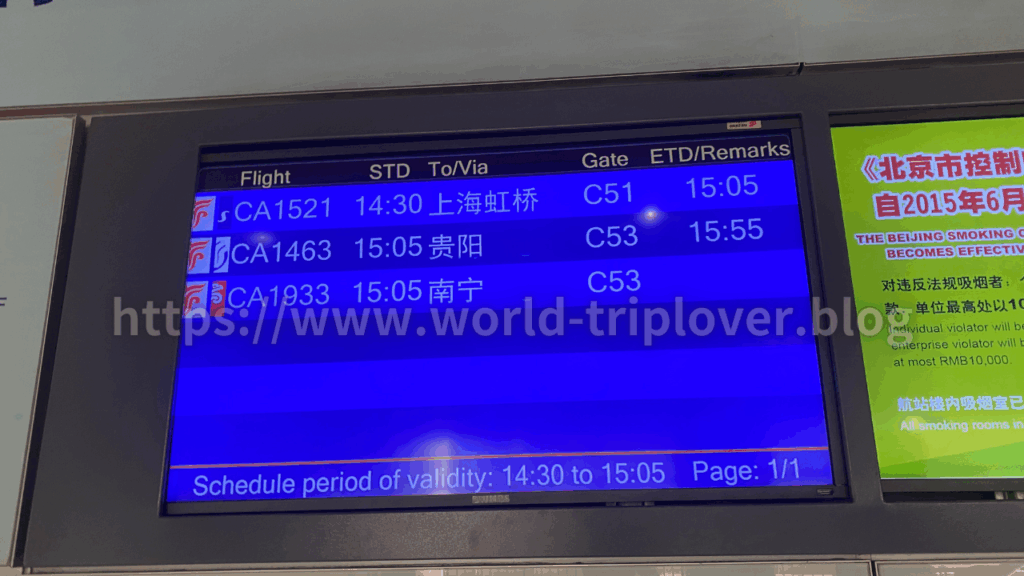 この日のCA1521便は14:30発の上海虹橋行き。北京から上海までは約2時間ほどの短距離フライトですが、ビジネス需要や観光客の利用も多いため、1日に何便も運航されています。
