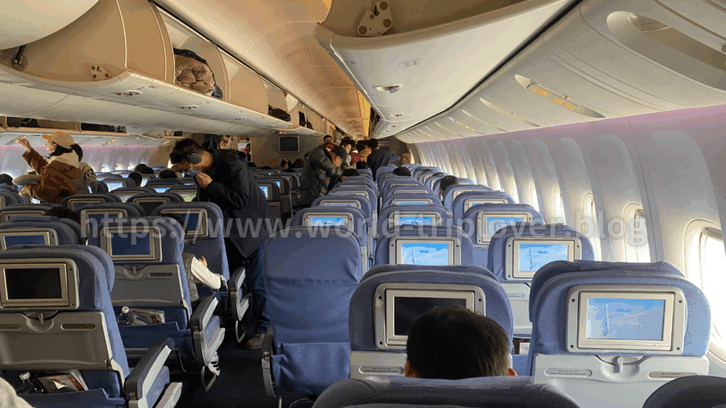 機内に入ると、広々とした3-3-3配列のエコノミークラスが広がっていました。国際線仕様なので、シートピッチ(足元の広さ)も国内線専用機材に比べると余裕があります。