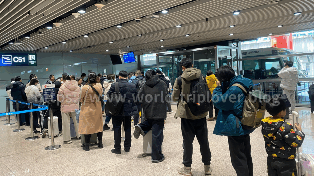 搭乗ゲートに到着すると、既に多くの乗客が並んでいました。搭乗案内はスムーズに進み、事前改札の後、機内へと移動します。