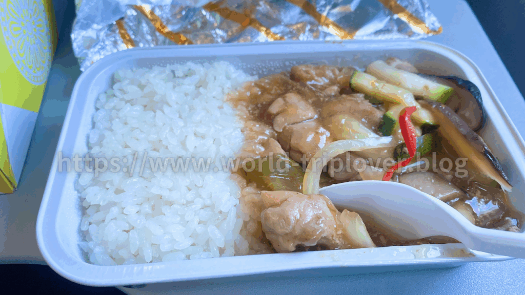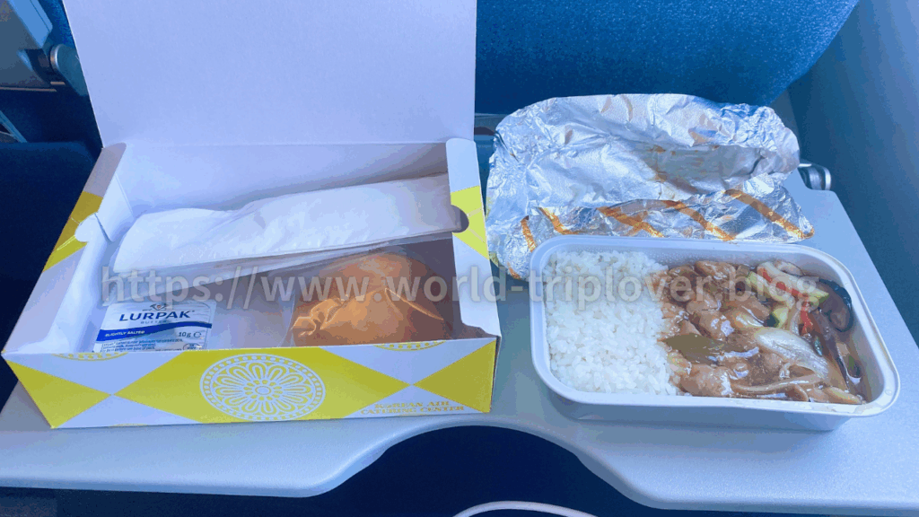 フライトが安定高度に達すると、機内食のサービスが始まりました。短距離路線なので軽食程度かと思っていましたが、しっかりとしたホットミールが提供されるのはさすが国際線。