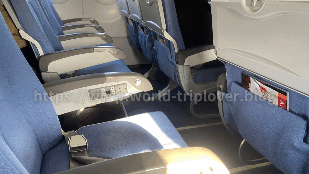 機内に入ると、3-3配列のエコノミークラスが広がっています。シートピッチは標準的ですが、意外と足元にゆとりがあり、2時間程度のフライトであれば十分快適に過ごせるレベルでした。