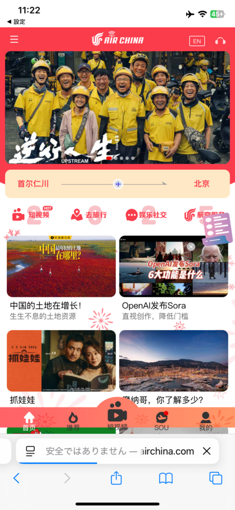 A321機材には機内Wi-Fiサービスが搭載されています。一般的なネット接続サービスではなく、エアチャイナが提供する限定的なコンテンツ用。