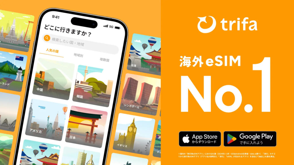 数ある海外eSIMの中でも、対応国の広さと柔軟な料金プラン、日本語でのサポートをバランスよく備えているのが「トリファ(Trifa)」です。