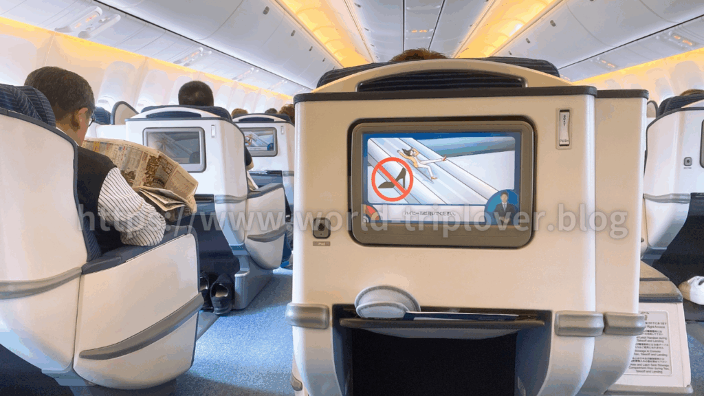 各座席には個人用のモニターが設置されていますが、正直に言うと画質はやや粗めで、操作性も今ひとつ。タッチパネルの感度がやや鈍く、最新機材に慣れている方だと物足りなさを感じるかもしれません。