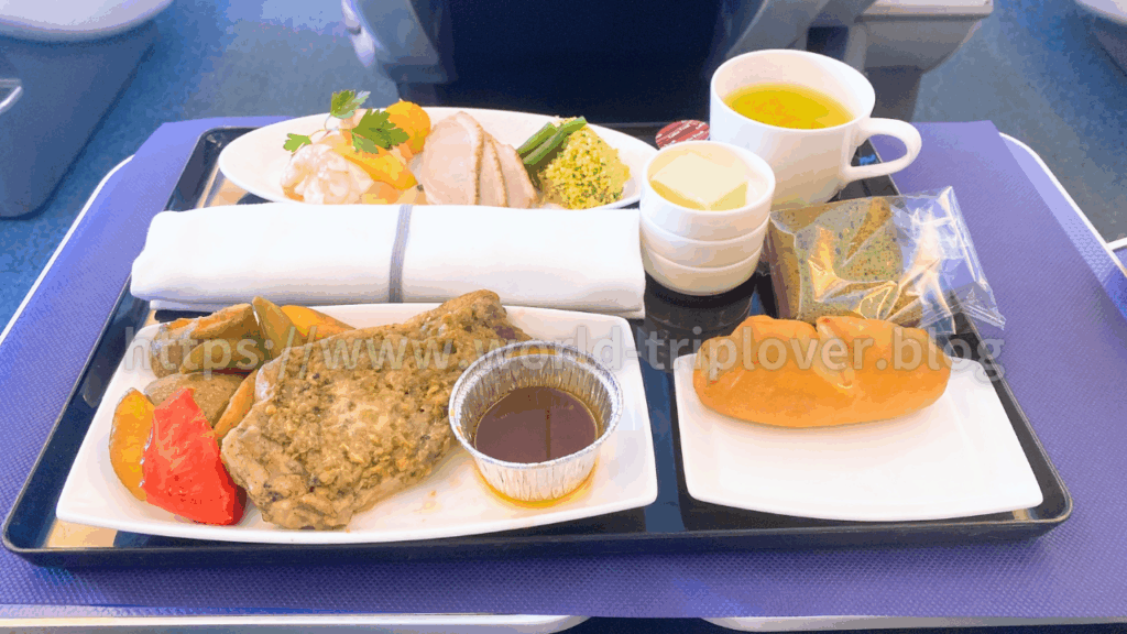 ビジネスクラスの機内食ですが、メインはビーフでした。熱々で柔らかく、肉厚ジューシーだったのを覚えています。