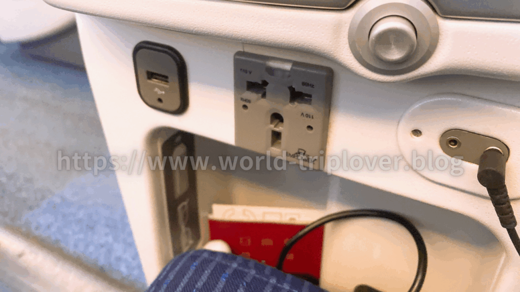 機内ではUSBポートとACコンセントがそれぞれの座席に設置されており、スマホやノートPCの充電が可能です。短時間のフライトとはいえ、充電環境が整っているのは嬉しいポイント。特にビジネス利用の方にはありがたい設備ですね。