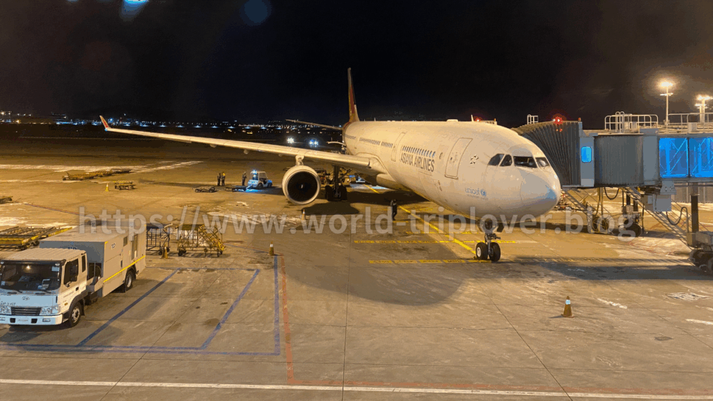 この便で使用された機材は、アシアナ航空のA330。中型ワイドボディ機で、短距離でも快適性が高く、座席のゆとりや安定した飛行性能で知られています。