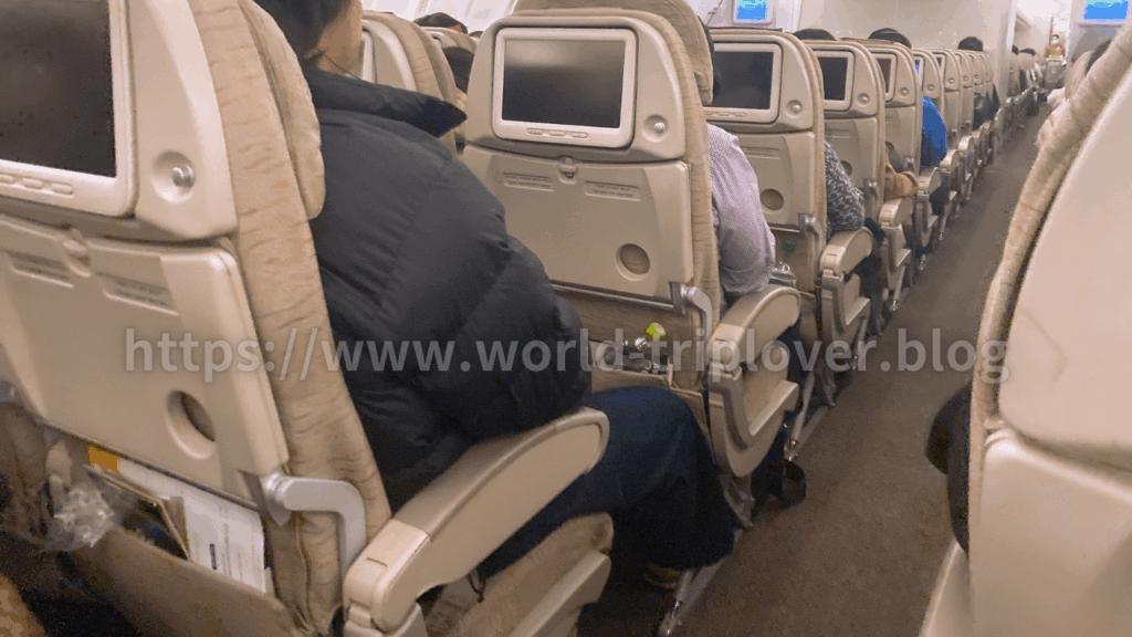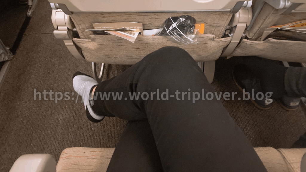 エコノミークラスの座席は、比較的ゆとりがある2-4-2の配置。足元も広く、深夜便でも長時間座っていても窮屈さを感じません。