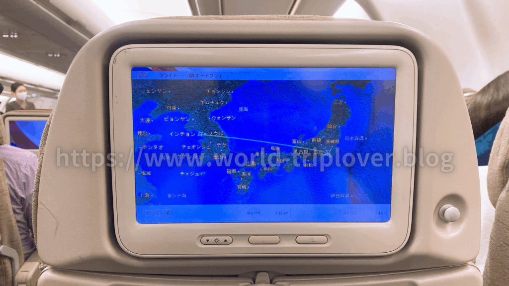 A330の座席には個人用モニターが装備されており、映画や音楽、フライトマップの確認が可能です。短距離便であるため、映画を1本観るにはちょうど良い長さ。