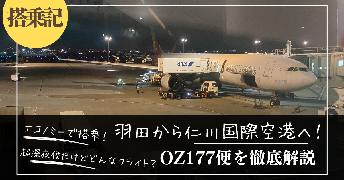アシアナ航空OZ177便の深夜便は、羽田から仁川への短距離フライトながら快適に過ごせるフライトでした。A330の座席はゆとりがあり、個人用モニターや機内食も提供され、短時間ながら十分なサービスが整っています。